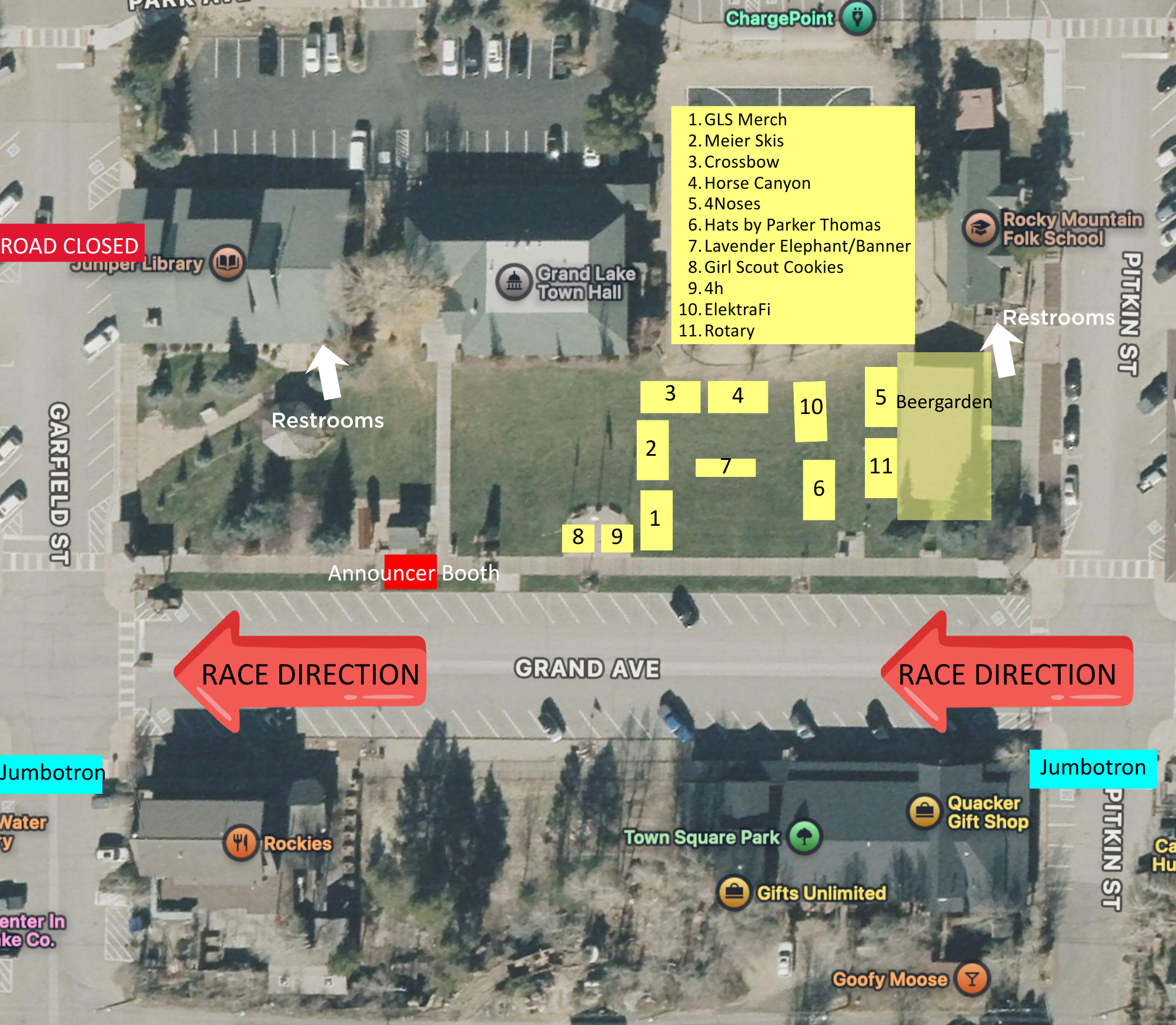 Entrance off of Town Plaza behind announcer booth. Overlooks track, call Delphine with questions. 970-389-9112